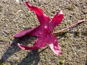 Yesterday, in the parking lot at work, a maple leaf rested on the pavement. The golden-hued morning light caught the leaf highlighting the red-tending-to-maroon tones. The leaf sharply contrasted the cold grey of the pavement, its vividness catching my eye. What if I picked up the leaf and saved it? Could archeologists in the far future figure out when the leaf fell from the tree?
